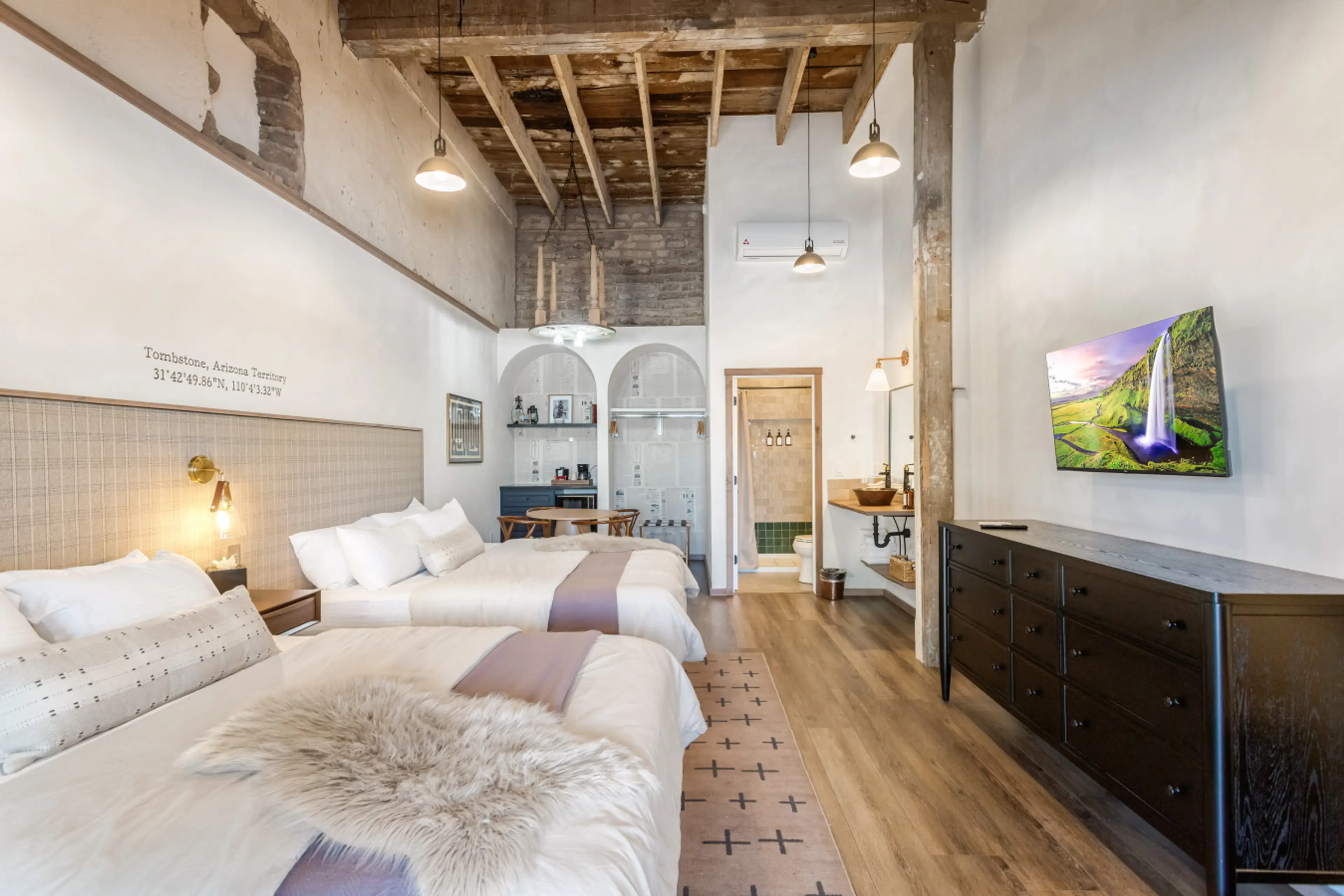 Newly Renovated hotel right in the heart of Tombstone Arizona. Clean and comfortable. This particular room is in the original adobe Livery building from the 1800's. We have renovated the rooms but kept the charm by exposing some of the adobe and timbers. Walking distance to Allen Street where there ...